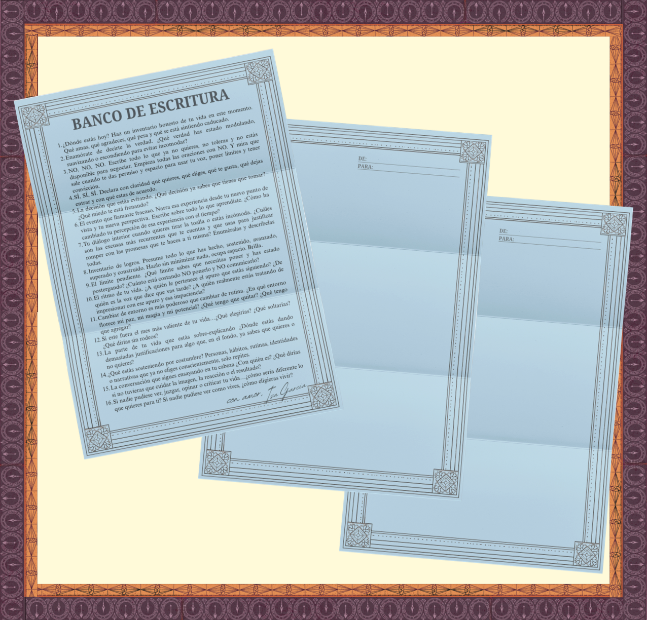 - ✉️ 2 Páginas de Cartas (A4): En papel celeste, con un marco elegante. Para escribir cartas que puedes guardar, quemar, enmarcar o enviar: a tu versión pasada, futura, al dinero, al cuerpo, a alguien que no está, o a ti.